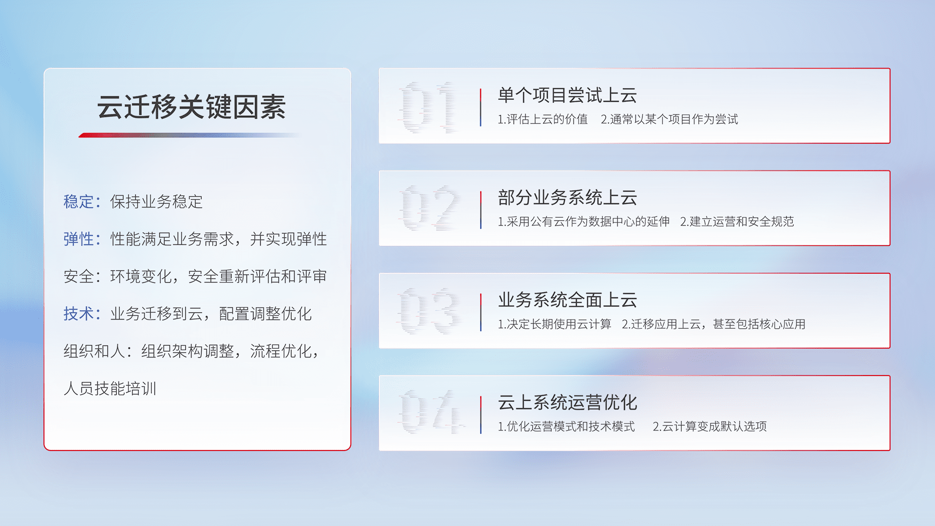 结合实际业务,,,,从规划设计、、、、云平台选型、、云原生改造、、、、数据迁移、、、、集成交付,,迁移全过程为客户识别最佳上云路径,,,做好风险识别管理,,,设计网络架构、、、、身份权限、、、安全审计合规、、操作审计、、日志审计、、、、监控告警策略、、多站点容灾设计等,,,,对云上基础设施进行整体规划,,,,提升IT治理水平,,,,以满足弹性、、高可用、、、高性能的需求。。。